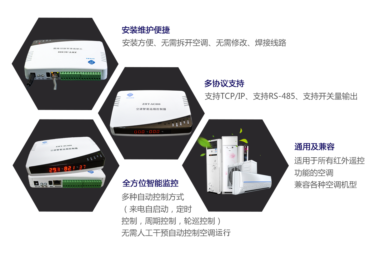 ZHT-AC800 網絡型空調智能啟動控制器,利用 PC 機控制軟件,通過網絡或 RS485 與設備進行通訊,可實現上百臺空調的集中聯網控制。通過學習空調遙控器的空調的開啟和關閉、工作模式、溫度調整等紅外信號,實現空 調斷電再來電自動啟動,并開啟到用戶需要的運行模式,同時具備溫度檢測控制功能,按用 戶配置的溫度值,當環境溫度達到設定值后,自動開啟和關閉空調,兼容市面上各種品牌柜式機、分體壁掛機、吸頂式機等各 種空調機機型。