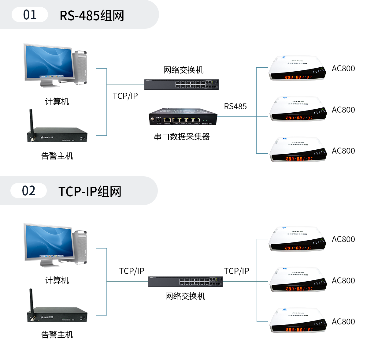 ZHT-AC800 網絡型空調智能啟動控制器,內置網絡及RS485通訊接口,可使用TCP/IP組網和RS485總線連接方式組網,可根據空調現場的位置分布靈活選擇組網方式,實現遠程集中管理所有空調。其系統組網圖如左圖所示。